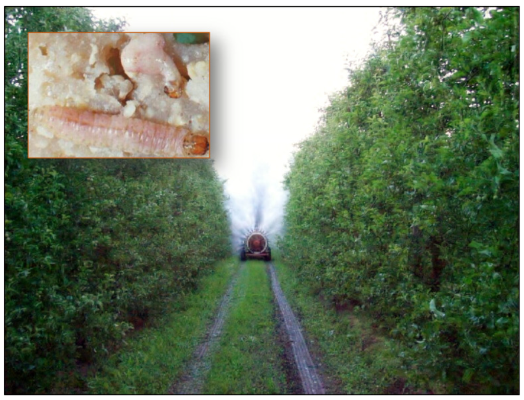 Application of Carpovirus Plus® in apple orchards in Río Negro, Argentina. Inset: C. pomonella larvae infected by CpGV (Image kindly provided by Graciela. Quintana; Instituto de Microbiología y Zoología Agrícola, Instituto Nacional de Tecnología Agropecuaria (IMYZA.INTA), Castelar, Argentina).