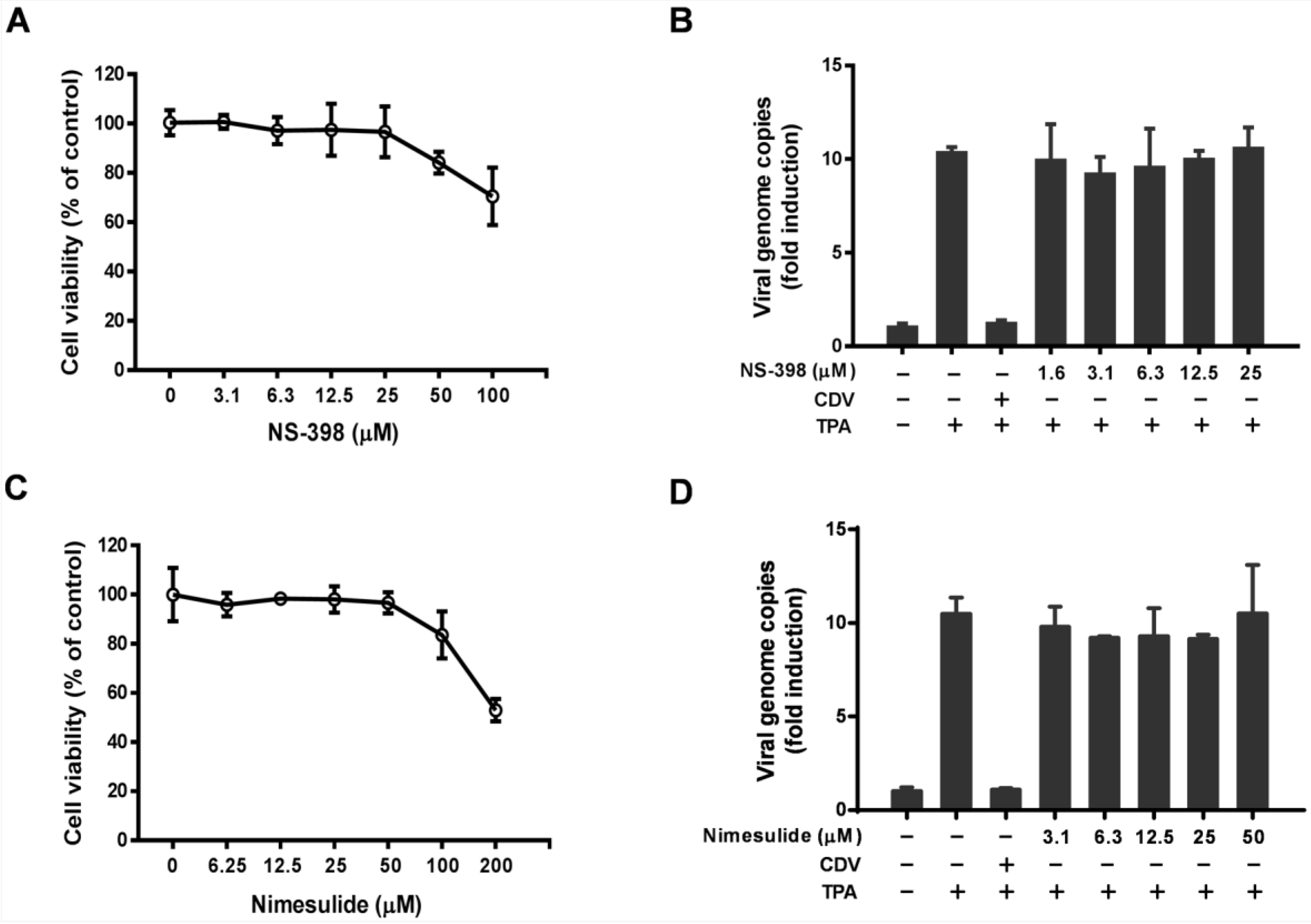- George Paul, A.; Sharma-Walia, N.; Chandran, B. Targeting KSHV/HHV-8 Latency with COX-2 Selective Inhibitor Nimesulide: A Potential Chemotherapeutic Modality for Primary Effusion Lymphoma. PLOS ONE 2011, 6, e24379. [Google Scholar] [CrossRef] [PubMed]