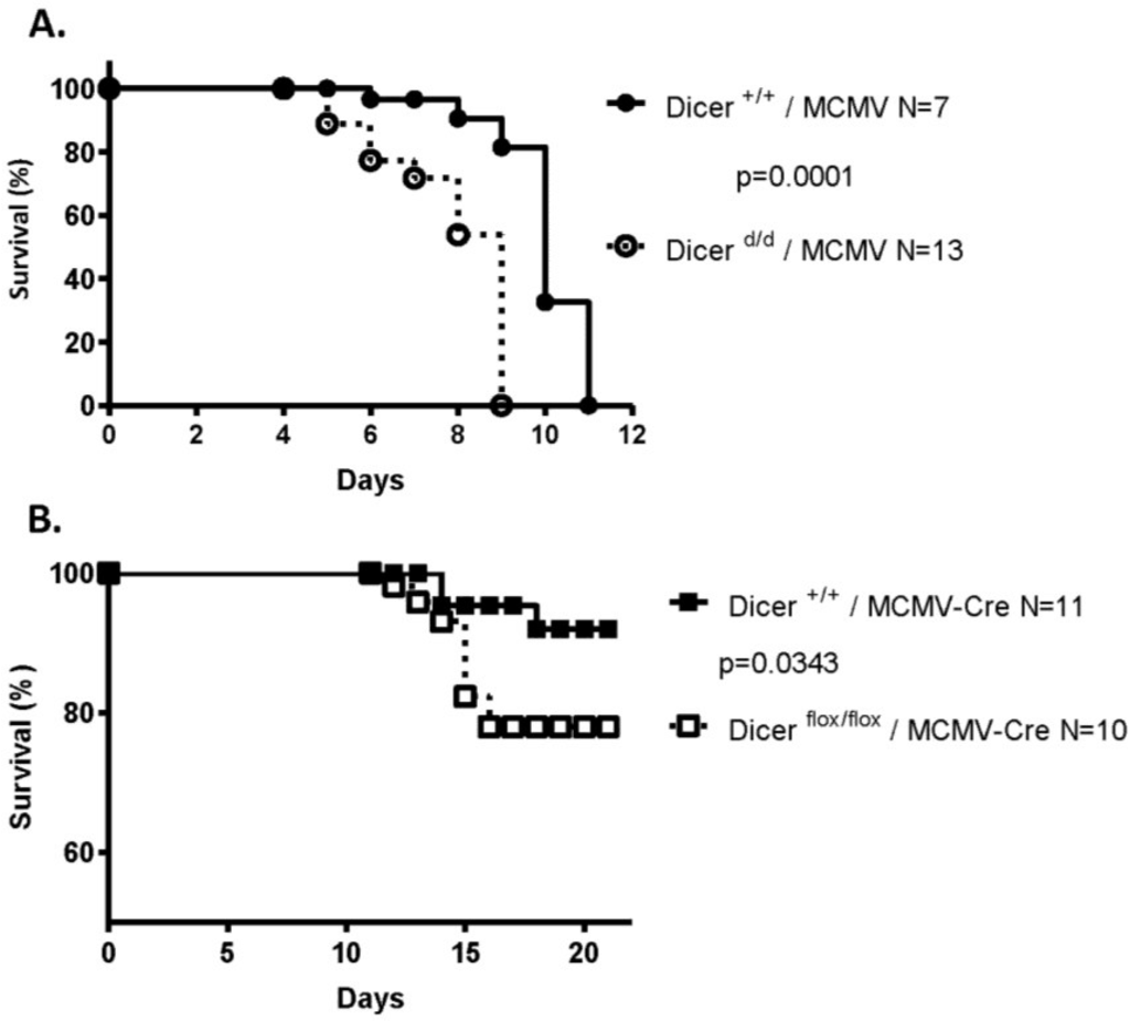 Increased lethality of Dicer-deficient newborns upon MCMV infection. (A). Control (Dicer +/+, N = 7) and mutant (Dicer d/d, N = 13) 4–8 h old neonates were infected by intraperitoneal injection of 50 p.f.u of MCMV (Smith strain, prepared in vivo). Survival of the pups was monitored every 12 h. (B). Dicer +/+ (N = 11) and Dicer flox/flox (N = 10) were infected with 500 p.f.u of a recombinant MCMV-Cre (prepared by amplification in NIH 3T3 cells).