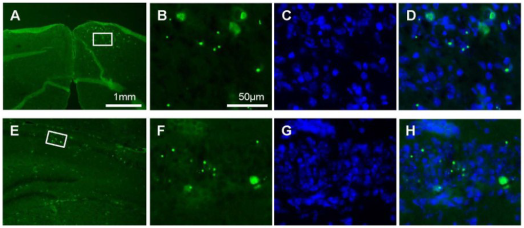 To unambiguously demonstrate the presence of the virus in the brain and to locate its replication sites we performed Immunohistochemistry (IHC) staining on frozen brain sections from MCMV-inoculated Dicer +/+ and Dicer d/d neonates. By using an antibody directed against the E1 protein (CROMA 103 Ab) we evidenced MCMV infection in the posterior brain region (bregma-3.08) in Dicer d/d mutants, which corresponds to the luminescent sites (Figure 5A,E). No staining was observed in the corresponding area of control brains (i.e., from infected wild-type mice). Interestingly, mutant brains stained strongly not only in foci as illustrated for the retrosplenial cortex (compare Figure 5B–F and C–G), but also in the alveus of the hippocampus or in individual, dispersed cells in the granular layers of the hippocampus (compare Figure 5B–F and D–H). Although Nissl often co-localized with E1 protein in our experiment (Figure 5G,H), in good agreement with a previous report [] showing that neurons are the primary target of MCMV infection in the brain, we cannot exclude that other cell types were also infected. We particularly observed frequent staining in elongated, epithelial-like cells in blood vessels of Dicer d/d brains (arrow in Figure 5H). Further immunofluorescence analyses revealed that the MCMV E1 protein was localized in nuclei (as detected by DAPI staining) in both the cortex (Figure 6A–C) and the hippocampus (Figure 6D–F).