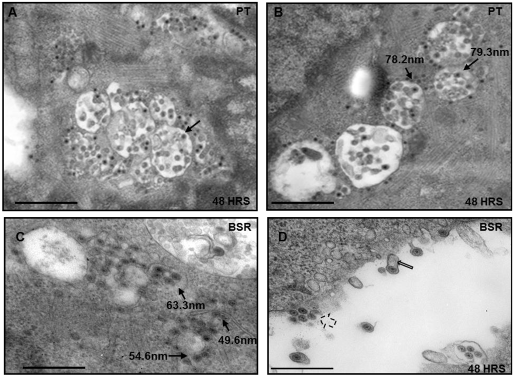 Intracellular distribution of BTV was analyzed to understand the growth phenotype of the virus in PT cells that have been derived from sheep kidney, the natural host of BTV. For this purpose, initially electron microscopy of ultrathin sections of PT cells infected with BTV (serotype 1) at MOI of 1 were analyzed for cytoplasmic distribution of BTV particles at 48 h pi (Figure 1). For comparison, BSR cells that are routinely used for BTV growth in the laboratory were used in parallel. In PT cells, a clear distribution of negatively stained virus particles measuring around 70 nm in diameter was observed within intracellular vesicles (Figure 1A,B, thin black arrows). Infected BSR cells also showed vesicular distribution of BTV at 48 h pi, but the particles within the vesicles were smaller (50 to 60 nm) and were much closer in size to BTV cores than mature virus particles (Figure 1C). In addition, majority of the particles were observed in the vicinity of membrane like structures in the cytoplasm and surrounding the vesicles (Figure 1C). Moreover, there were budding virus particles and the presence of membrane-like structures surrounding the released virus particles were visible (Figure 1D, thin open black arrows). Interestingly, the budding phenomenon was not observed in infected PT cells (results not shown). Cell sections of infected BSR cells also showed BTV release by perturbation of cellular membranes (Figure 1D, broken black arrows). These results are consistent with previous reports of BTV budding from BSR cells and the presence of membranes that surround released particles [6,28].