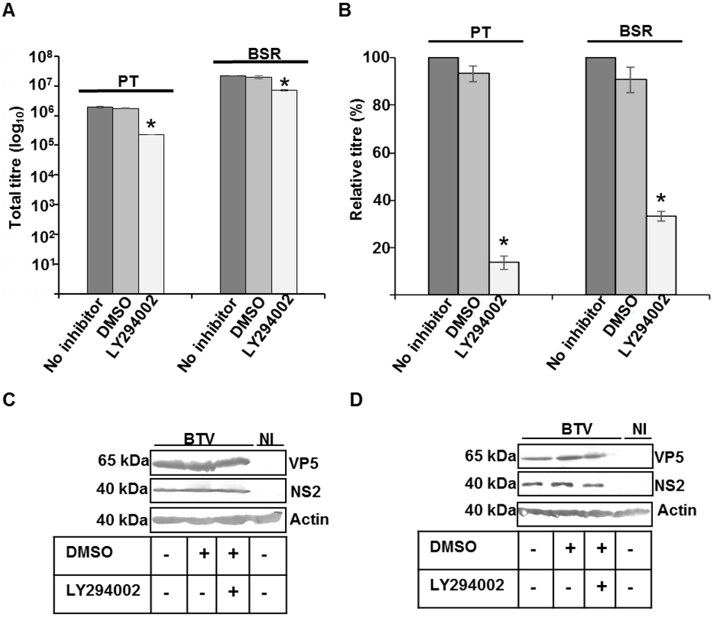 The effect of PI3K inhibition on total virus titre and protein production was assessed by infecting PT and BSR cells with WT BTV at 1 MOI for 12 h. Subsequently, the cells were washed and then further incubated for 4 additional hours in presence of 100 μM of LY294002. BTV is known to enter cells thorough endosomes [36,43] and it has been reported that the first cycle of BTV replication is completed within 12–16 h of infection [39,44]. Hence, in order to avoid the possible effect of LY294002 mediated inhibition of PI3K activity on virus entry and to restrict our study to the role of PI3K on BTV assembly and/or release, the infected cells were treated with the inhibitor between 12–16 h pi. Controls consisted of WT BTV infected cells incubated in the absence of LY294002 or incubated with DMSO, the diluent used for LY294002. Compared to the controls, LY294002 demonstrated a significant reduction in the total titres and the effect was more pronounced in PT cells (p < 0.01) than for BSR (p < 0.05) (Figure 2A). When the total titre was plotted as a relative percentage of the control virus titre that was not treated with DMSO or LY294002, a more significant reduction in the relative titre was also observed in repeated experiments for PT (p < 0.001) than BSR cells (p < 0.01) (Figure 2B). On average, infected and LY294002 treated PT cells exhibited a five times reduction relative to the control infected and non-treated cells, and the reduction was about 2.5 times for BSR (Figure 2B). An additional control comprising of infected cells treated with diluent DMSO showed no difference in relative virus titre to that of cells infected but not treated. However, the effect of PI3K inhibition on viral protein synthesis in Western blot (WB) showed equivalent expression of BTV VP5, the major outer capsid protein and NS2, a major non-structural protein, which is responsible for the formation of virus inclusion bodies (VIBs) in infected cells treated with LY294002, untreated cells and cells treated with the diluent (Figure 2C,D). Cellular actin was used as the loading control. Since, PI3K inhibition did not perturb viral protein synthesis but there was a significant decrease in the virus titre, these data indicated that the integrity of MVBs might be important for BTV growth. In addition, the integrity of the MVBs appeared to be more important in sheep cells (PT) than BSR cells.