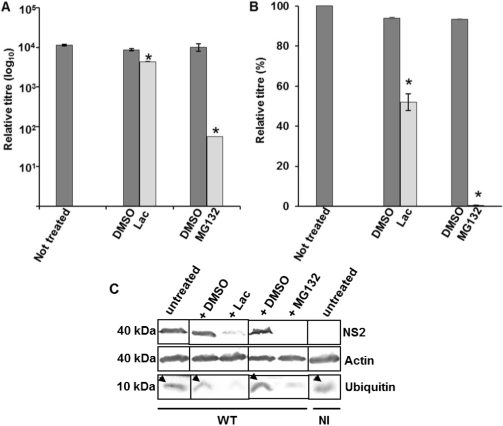 Influence of proteosome inhibitors on BTV growth in PT cells. (A,B) Cells infected with WT BTV at 0.1 MOI were incubated with MG132 or lactacystin. The total (A) and relative (B) titres were assessed at 12 h pi. The plaque assays were done in triplicate and bars represent standard error. Significant difference in the virus titres were designated by the asterisk (*). Presence or absence of diluent DMSO and inhibitors have been indicated below the graph; (C) Expression of NS2, actin and ubiquitin in treated and infected PT cells. The cells were treated similar to A. Lysates were analyzed by SDS-PAGE and Western blotting. Molecular masses and proteins are indicated on left and right, respectively. Arrows represent presence of ubiquitin in untreated cells. Presence or absence of diluent DMSO and inhibitors has been indicated on the top of the panel. NI signified uninfected cells.