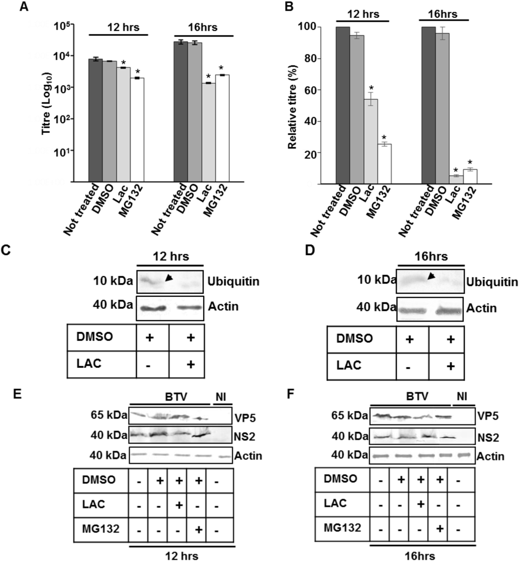 Subsequently, another set of experiments were designed to specifically probe the effect of ubiquitin inhibition on the later stages of BTV maturation and or release. For this purpose, PT cells infected with BTV at low MOI, were incubated for only 10 or 14 h and then further incubated for 2 additional hours in presence of 20 μM of MG132 or lactacystin (Figure 4). Analysis of total virus titres in presence of inhibitors demonstrated that compared to cells that were either untreated or treated with DMSO, MG132 and lactacystin significantly decreased the total viral titres at 12 and 16 h pi (Figure 4A). While at 12 h pi the effect was more pronounced for MG132 (p < 0.01) than lactacystin, (p < 0.05), at 16 h pi the decrease for the two inhibitors (p < 0.05) was equivalent. In addition, when the inhibitor induced decrease in virus titre was plotted as a relative percentage to that of infected cells that were not treated with inhibitors (Figure 4B), MG132 (p < 0.001) again demonstrated a more significant decrease than lactacystine (p < 0.01) at 12 h pi. However, at 16 h pi the relative decrease was similar for both the inhibitors. Monitoring MG132 and lactacystin mediated inhibition of free cellular ubiquitin demonstrated significantly lower (p < 0.05) level of ubiquitin (<70% ± 0.03) than untreated cells or cells incubated with DMSO (Figure 4C,D). As before, no significant difference was observed in the ubiquitination pattern of infected cells that were treated or not treated with the inhibitors (results not shown). Measuring the virus protein production also did not show any significant difference (p > 0.05) in NS2 or VP5 synthesis at 12 (Figure 4E) and 16 (Figure 4F) h pi in cells that were treated with lactacystin or MG132 (Figure 4E,F) and cells that were either untreated or treated with DMSO. There was also no difference in the expression of actin, the loading control (Figure 4C–F). Since in this assay ubiquitin inhibition had no effect on virus protein production but still affected total titre at early time points (12 or 16 h pi), this indicated that influence of proteasome inhibitors on BTV replication might be either linked to the maturation of complete virus particles and or to an early non-lytic release of BTV particles.