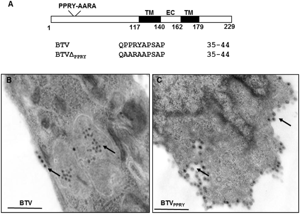 Mutation of PPXY late domain in NS3. (A) Schematic representation depicting position of the PPRY motif in NS3. The numbers designate amino acid positions in NS3 sequence; TM and EC signifies transmembrane domain and extra cellular regions (B,C). Electron Microscope analysis of PT cell sections infected with WT BTV (B) and BTVΔPPRY (C) analyzed at 20 h pi. Virus particles under the plasma membrane and within vesicles (black arrows) been indicated. Bar, 500 nm.