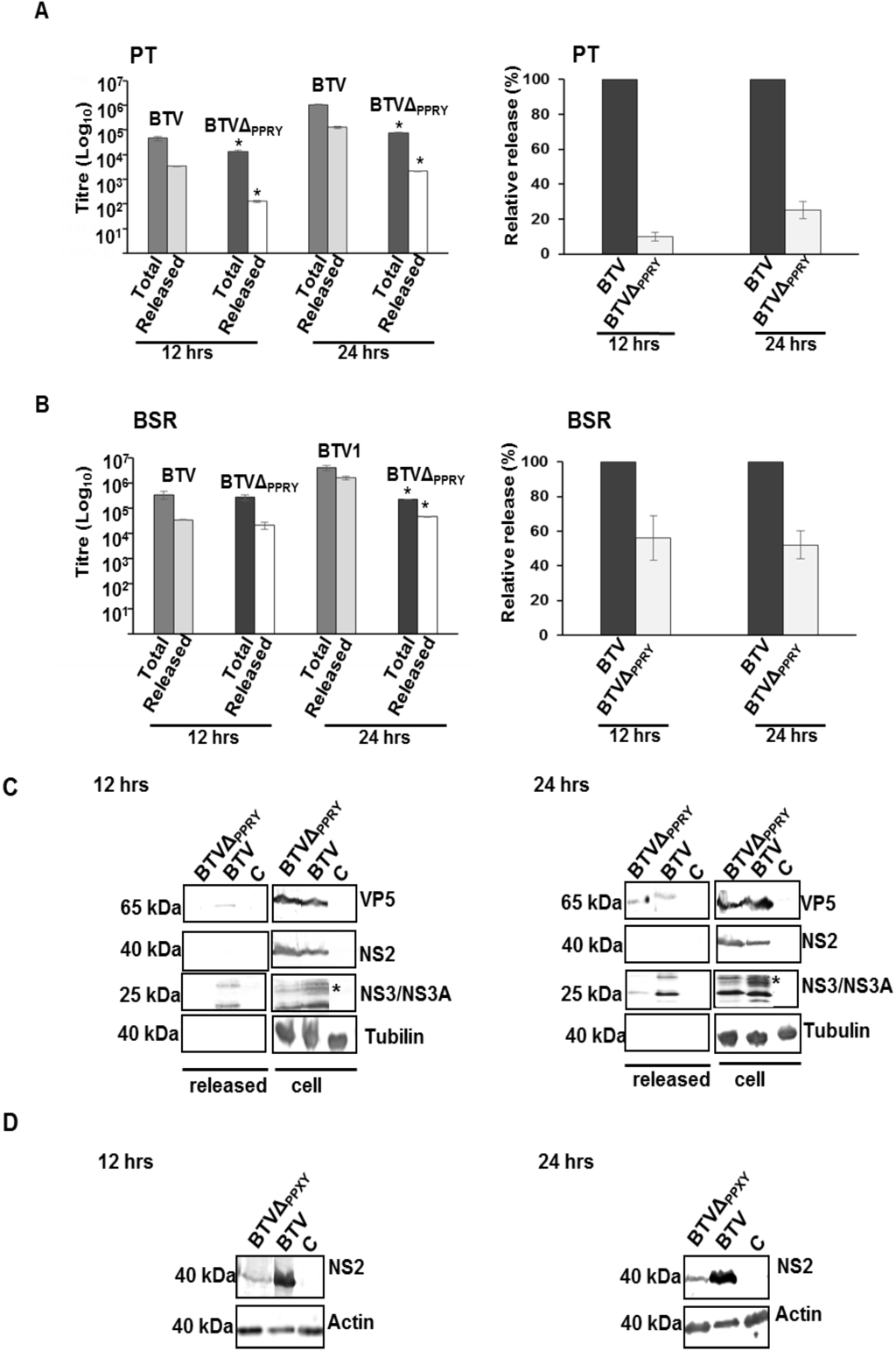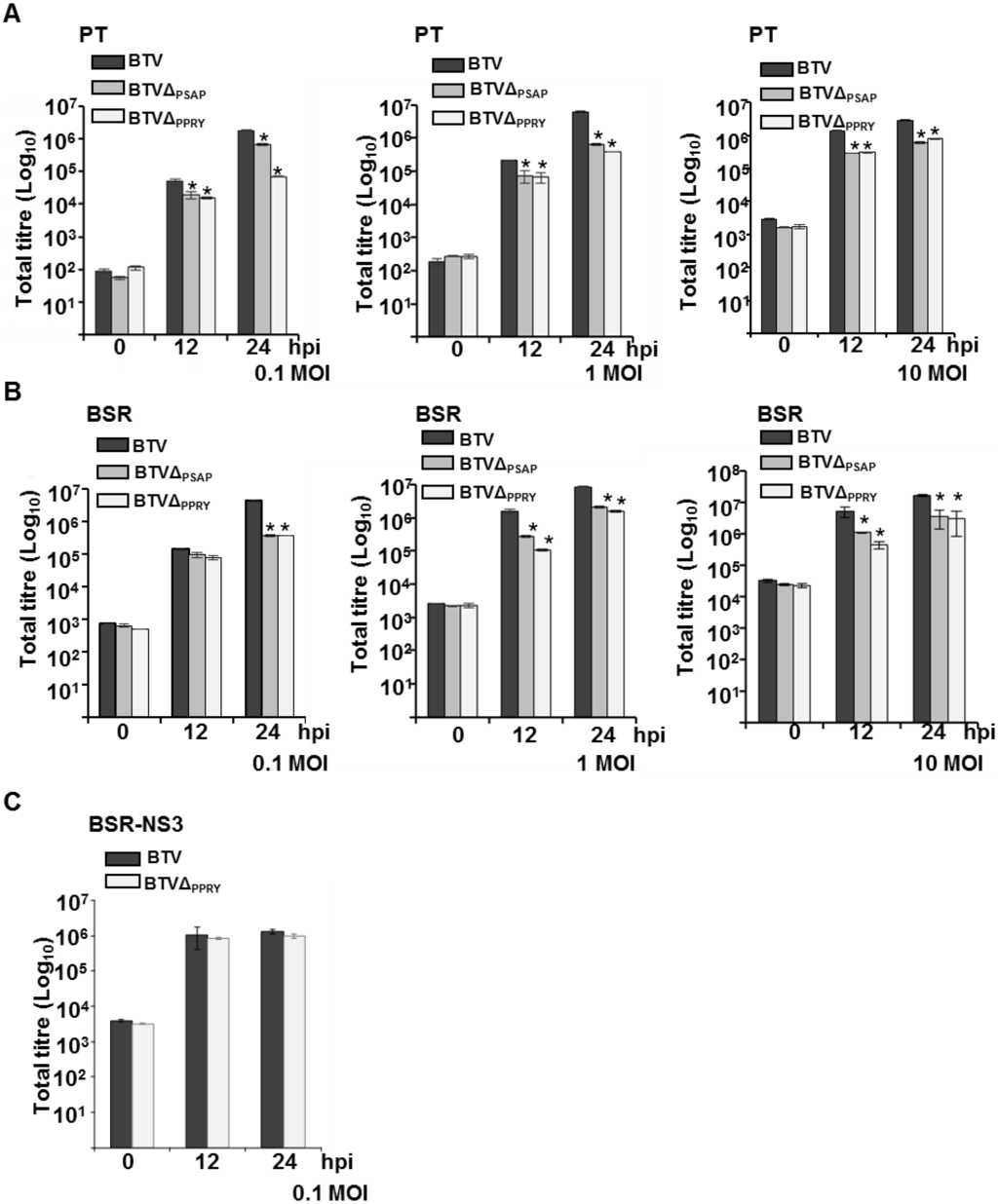 Characterization of BTVΔPPRY and BTVΔPTAP. Total titres at different times pi of either BTVΔPPRY, BTVΔPSAP or BTV in PT (A); BSR (B) and BSR-NS3 (C) cells were determined, expressed as PFU/mL, and plotted on logarithmic scales. Asterisk (*) indicates that the decrease in titres of BTVΔPPRY or BTVΔPSAP at 12 and 24 h pi is statistically significant to BTV (p < 0.05). The MOI of infection, cell types and viruses used have been indicated in each graph.