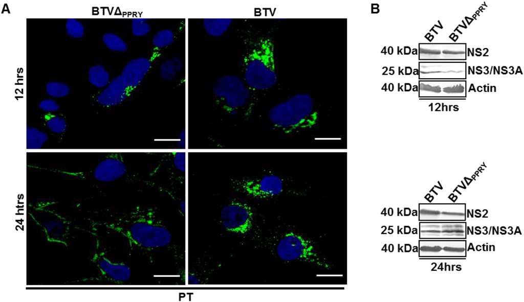 Visualization of intracellular distribution of NS3 showed a difference between BTVΔPPRY and WT BTV infections at 12 and 24 h pi in PT cells (Figure 7A). At 12 h pi, NS3 expression was restricted to juxta-nuclear areas of majority of PT cells (92% ± 1) (Figure 7A, left upper panel). Further, although at 24 h pi, some cytoplasmic punctate expression was observed, strikingly majority of NS3 protein was localized to the cellular margins (85% ± 1.4) (Figure 7A, left lower panel). In comparison, WT BTV infected PT cells analyzed at 12 (82% ± 3.5) and 24 h (83.6 ± 0.7) pi exhibited NS3 in juxtanuclear areas, as small puncta in the cytoplasm and also on the cellular margins (Figure 7A, right). Comparison of BTV protein production at 12 and 24 h pi (Figure 7B), showed that expression of NS3 in PT cells infected with WT BTV was slightly higher than that of BTVΔPPRY at 12 h pi (Figure 7B, upper panel). However, densitometric evaluation of protein production in infected PT cells did not demonstrate any significant difference (p > 0.05) at both 12 (Figure 7B, upper panel) and 24 h pi (Figure 7B, lower panel).