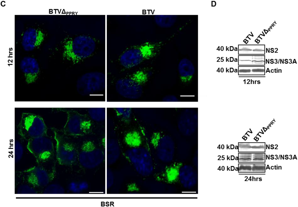 Effect of PPRY domain mutation on NS3 distribution. Localization (A,C) and expression (B,D) of NS3 in (A,B) PT and (C,D) BSR cells infected with BTVΔPPRY or WT BTV1. NS3 was visualized in green and nucleus has been labelled with Hoechst (blue). Scale included in each panel represents 20 µm. The expression of NS2, NS3 and actin in infected (B) PT and (D) BSR cells were analysed at 12 and 24 h pi. Lysates were analyzed by SDS-PAGE and Western blotting. Molecular masses and virus proteins are indicated on left and right, respectively.