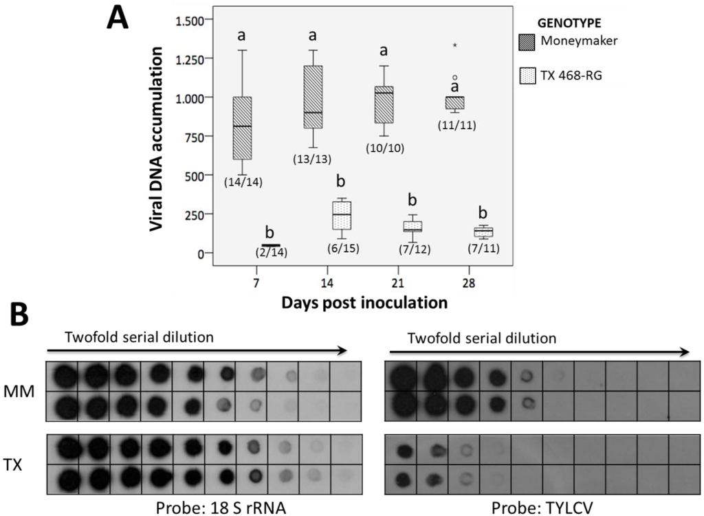 (A) Accumulation of tomato yellow leaf curl virus (TYLCV) DNA at several days post inoculation (dpi) in non-inoculated young leaves of systemically infected TX 468-RG and “Moneymaker” tomato plants inoculated with an isolate of the Israel strain of TYLCV (TYLCV-IL) by Agrobacterium tumefaciens-mediated inoculation. One independent group of plants was used per tomato genotype and date. Virus DNA content is estimated from densitometry measure of hybridization signals obtained in digitized imaging of autoradiographs (kilopixels) of dot blot hybridizations using a TYLCV-IL-specific probe and total nucleic acids (TNA) extracted from plants and normalization of values per plant with the signal from the hybridization with a 18S ribosomal RNA probe. Densitometry values corresponding to the dilution 1:1 of 400 ng of TNA are represented in a Box-and-Whisker plot. At each date, an arbitrary value of 1000 was given to the value of one MM infected plant and values of the other plants were referred to this one. In each case, the number of plants that resulted infected vs. the number of inoculated plants was indicated at the bottom of each box. Outliers are shown and at each date, values with the same letter are not significantly different (sequential Bonferroni tests under Generalized Linear Model, p = 0.05); (B) Dot blot hybridization of serial dilution 1:1, 1:2, 1:4, 1:8, 1:16, 1:32, 1:64, 1:128, 1:256, and 1:512 of TNA extracts from two TYLCV-IL-infected plants each of TX 468-RG (TX) and “Moneymaker” (MM) tomatoes at 28 dpi. Equivalent dot blot dilution series were analyzed with probes against to either TYLCV-IL or to 18S rRNA gene as loading control.