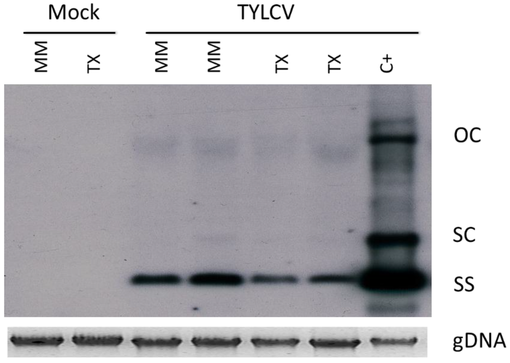 Southern blot hybridization analysis of total nucleic acids extracted from TX 468-RG (TX) and “Moneymaker” (MM) leaves agroinfiltrated with an infectious clone of an isolate of the Israel strain of tomato yellow leaf curl virus (TYLCV-IL). The analysis was conducted at five days post Agrobacterium tumefaciens-mediated infiltration. Equivalent preparations from noninfected (Mock) or from TYLCV-IL-systemically infected tissues (C+) of control tomato plants were included. Positions are indicated for the single-stranded genomic DNA (SS) and for the open circular (OC) and supercoiled double-stranded DNA forms of TYLCV-IL derived from input DNA; genomic DNA (gDNA) was included as loading control.