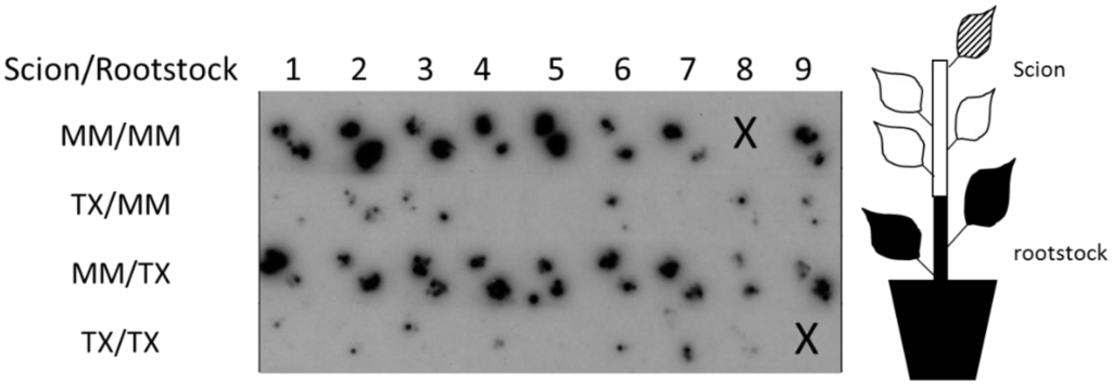 Detection of an isolate of the Israel strain of tomato yellow leaf curl virus (TYLCV-IL) in tissue blots of cross sections of petioles from newly emerged young leaves (two blots per sample were made) of TX 468-RG or “Moneymaker” healthy scions grafted onto “Moneymaker” or TX 468-RG rootstocks infected with TYLCV-IL. Detection was performed at 28 days after grafting by hybridization using a DIG-labeled DNA probe to TYLCV-IL. X indicates no sample present. A schematic representation of the grafted plant and the leaf analyzed (shadowed) is shown at the right of the figure.