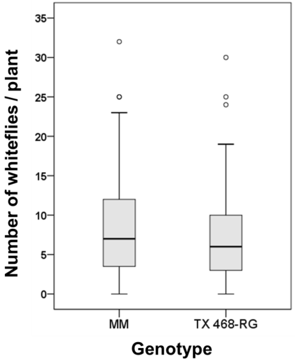 Bemisia tabaci settling on TX 468-RG or “Moneymaker” (MM) healthy tomato plants (50 test plants in a no-choice preference test). Number of whiteflies per test plant (sum of numbers present in three leaflets of each test plant) at 24 h after release of 30 B. tabaci MED adult whiteflies per test plant is represented in a Box-and-Whisker plot. Outliers are shown.
