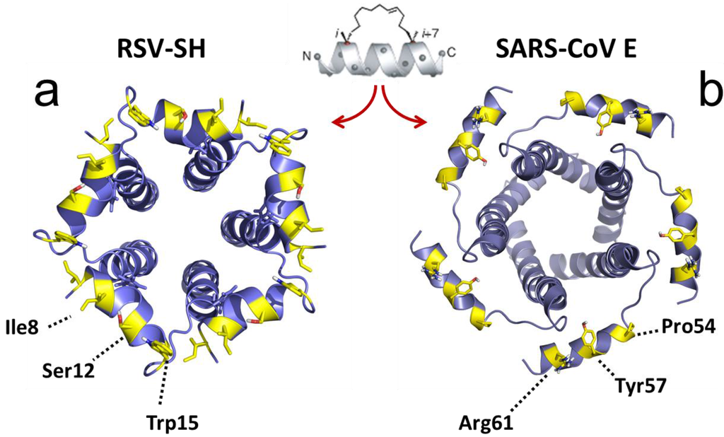 RSV SH and SARS-CoV E protein channels. (a) RSV SH protein channel and (b) SARS-CoV E protein channel, viewed from the cytoplasmic side [126,148]. The residues exposed to the cytoplasmic side (yellow) may be actively involved in protein-protein interactions and these cytoplasmic α-helices can be used as templates for stapled α-helical peptides.