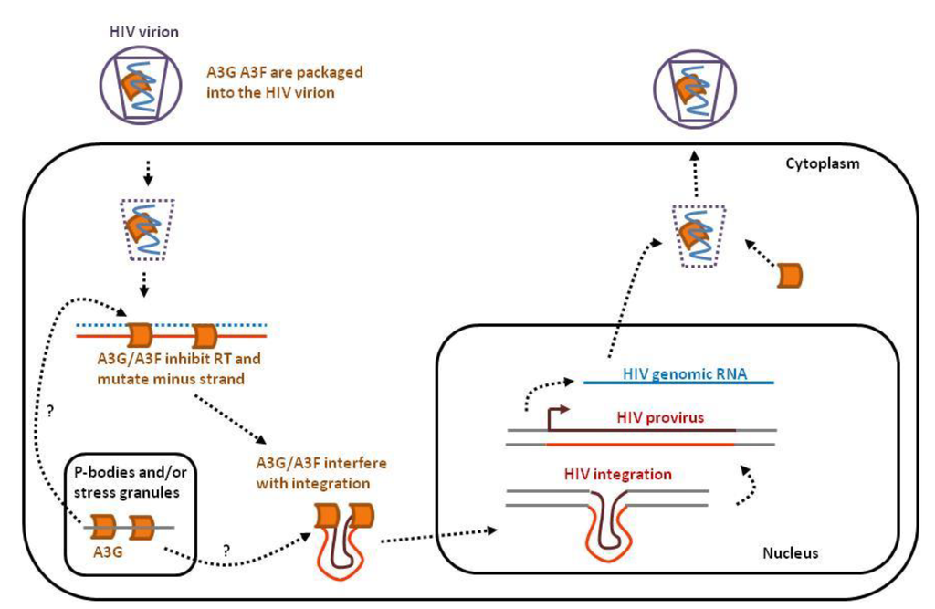 Figure 1. APOBEC3s interfere with several key steps of the HIV infectious cycle. After binding of the HIV virion to the cell membrane, the single-stranded RNA genome (in blue) is released into the cytoplasm together with APOBEC3G and 3F (orange). APOBEC3 proteins expressed by the host cell concentrate in P-bodies and stress granules. A3G and A3F inhibit reverse transcription, mutate viral DNA and perturb proviral integration into the host genome. In the absence of HIV Vif, A3G and A3F will be incorporated into the budding virions.