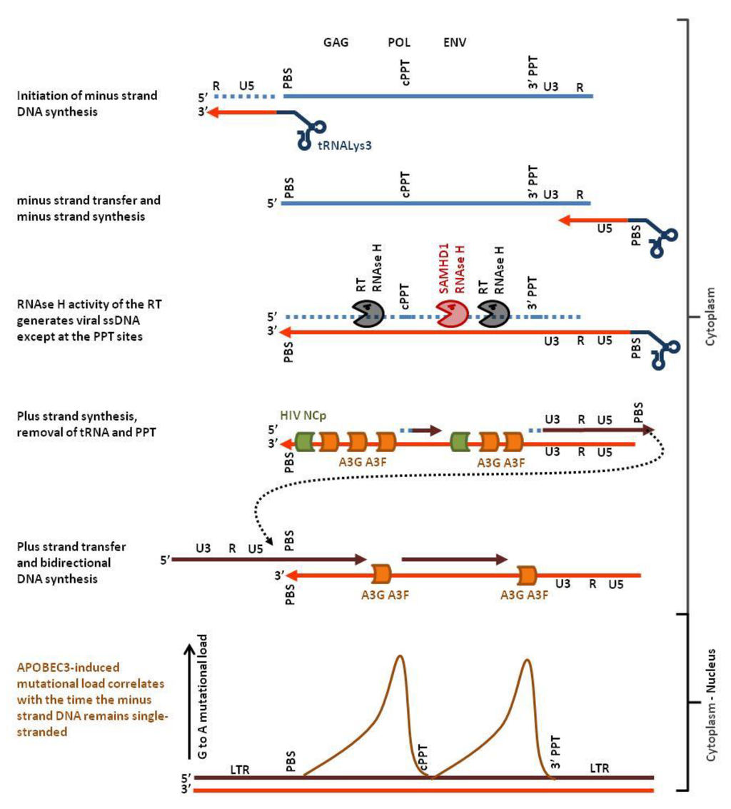 APOBEC3-induced mutations are almost always G-to-A transitions of the plus-strand genetic code. Moreover, the mutation load is not homogeneous along the HIV provirus but presents two highly polarized gradients, each peaking just 5′ to the central polypurine tract (cPPT) and 5′ to the LTR (long terminal repeat) proximal polypurine tract (3′PPT) [33]. As illustrated in Figure 2, this mutational signature is due to the mechanism of HIV reverse transcription. Binding of the human tRNALys3 to the primer binding sequence (PBS) initiates the minus strand DNA synthesis by the virus-encoded reverse transcriptase protein (RT). The RT-associated ribonuclease H activity (RNAse H) selectively degrades the RNA strand of the RNA:DNA hybrid leaving the nascent minus-strand DNA free to hybridize with the complementary sequence at the 3′ end of the viral genomic ssRNA. After minus strand transfer, the viral RNA is reverse-transcribed into DNA. Whilst DNA synthesis proceeds, the RNAse H function cleaves the RNA strand of the RNA:DNA. Two specific purine-rich sequences (polypurine tracts cPPT and 3′PPT) that are resistant to RNAse H remain annealed with the nascent minus strand DNA. The reverse transcriptase uses the PPTs as primers to synthesize the plus-strand DNA. Finally, another strand transfer allows the production of the 5′ end of the plus-strand DNA (reviewed in [34]). From this complex multistep process, it appears that only the minus strand can be single-stranded (light red in Figure 2). Thus, G to A mutations observed on the plus strand (dark red in Figure 2) originate from C-to-T mutations on the minus strand. The gradient of mutational load actually correlates with the time that the minus strand remains single-chain [33].