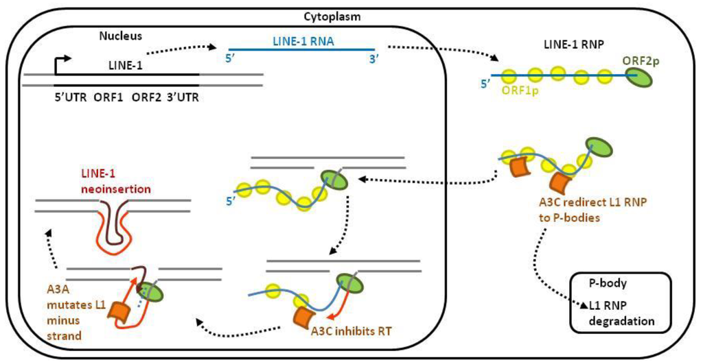 About half of the human genome is constituted by repetitive elements. Among them, non-LTR retroelements LINE-1 (long interspersed nuclear element-1), SINE (short interspersed nuclear elements) and Alu are capable of retrotransposition, i.e., inserting a copy of themselves elsewhere in the genome. Since retrotranpositions can be harmful for genome integrity, these events are tightly controlled. In fact, only a small proportion of endogenous retroelements remains active in the germline cells because APOBEC3s protect the host genome from unscheduled retrotransposition (Figure 3). LINE-1 retrotransposition is initiated by transcription of a full-length LINE-1 RNA and translation of ORF1p and ORF2p. These two proteins associate with LINE-1 RNA to form the LINE-1 RiboNucleoProtein (L1 RNP) complex. Upon translocation of L1 RNP into the nucleus, LINE-1 is reverse transcribed and integrated into a new site of the host genome. A3C restricts LINE-1 retrotransposition in a deaminase-independent manner by redirecting and degrading the L1 RNP complex in P-bodies [20]. Within the nucleus, A3C also impairs LINE-1 minus strand DNA synthesis [20]. A3A prevents LINE-1 retrotransposition by deaminating the LINE-1 minus strand DNA [64]. Consistently, RNAse H treatment increases deamination of the LINE-1 minus strand [64].