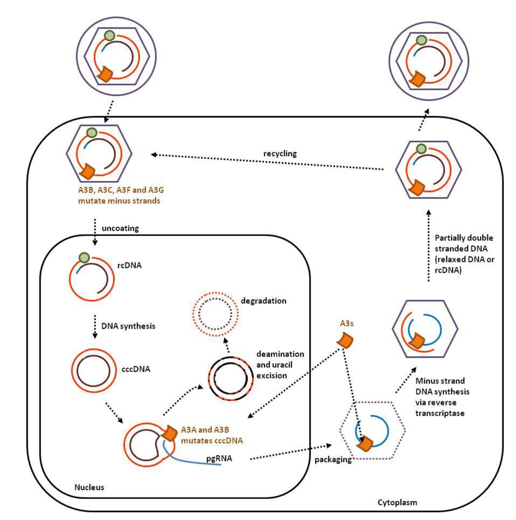 Figure 4. APOBEC3s interfere with several steps of the HBV replication cycle. The HBV viral particle contains a partially double-stranded DNA genome (relaxed circular DNA or rcDNA) that can be edited by A3G and A3F. Unlike HIV, HBV does not appear to encode Vif-like protein. Upon transfer into the nucleus, the plus strand of the rcDNA is replicated to form the covalently closed circular DNA genome (cccDNA). A3A and A3B deaminate the cccDNA genome leading to uracil excision and subsequent degradation.