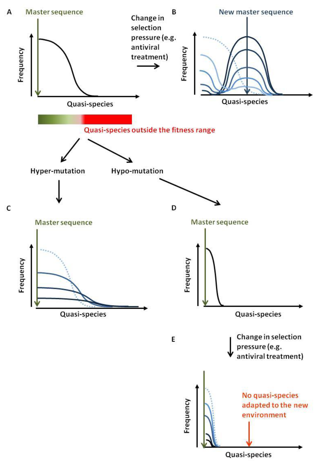 Viral quasi-species refer to a population of distinct but closely related viral genomes that differ only by a limited number of mutations. The distribution of variants is dominated by a master sequence that displays the highest fitness within a given environment (Figure 7A). High mutation rates during viral replication are the driving force for quasi-species generation. Lethal mutations or inappropriate adaptation to the environmental conditions (e.g., anti-viral therapy, immune pressure) will clear unfit genomes. When conditions change, the fittest quasi-species may differ from the master sequence. Providing that the distribution contains an adequate variant, a new population will grow (Figure 7B). The rate of mutation and the selection pressure will dictate the wideness of the distribution. If the environmental changes are too drastic or the quasi-species distribution too narrow, the viral population will be unable to recover [80].