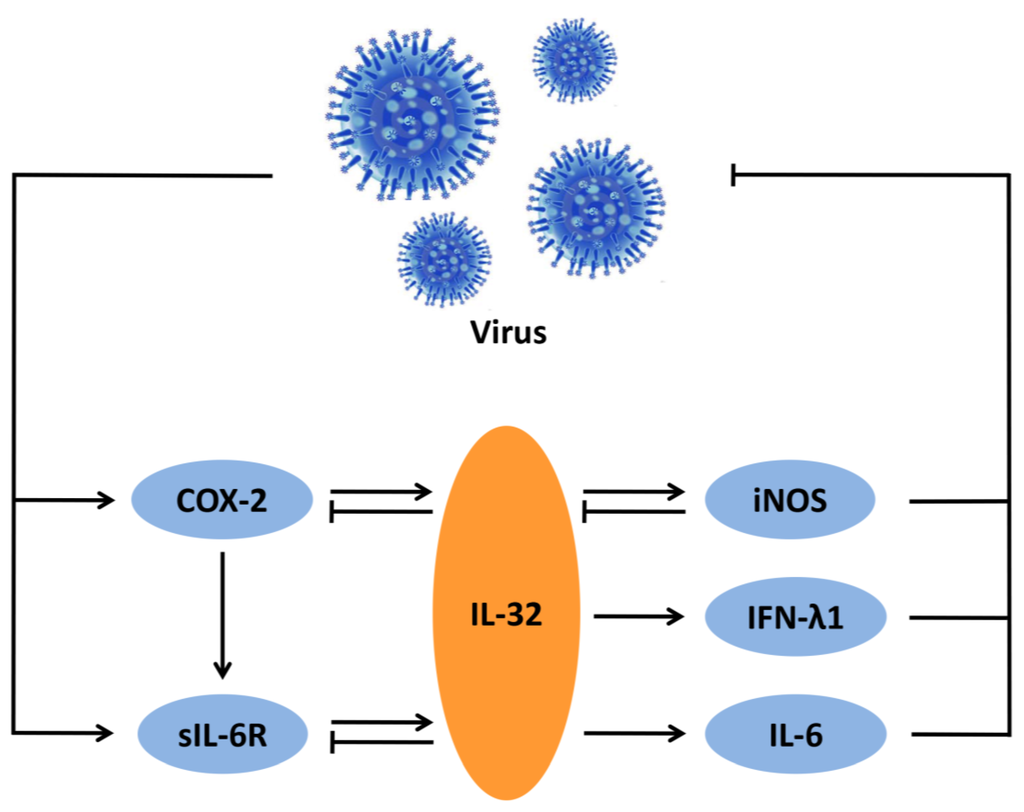 Since its initial description as a natural killer cell transcript in 1992 [2], our understanding of the biology of IL-32 has gradually increased. We can conclude from the literature that IL-32 is a critical pro-inflammatory mediator, which has essential antiviral functions. Whether activating iNOS, IFN-λ1, and IL-6, or inhibiting COX-2 or sIL-6R by a feedback mechanism, the IL-32-centered inflammatory network has become an important presence. Because IL-32 plays a key role in the inflammatory response against virus infection, developing a therapeutic strategy that targets IL-32 should be an important research field. Considering that IL-32 expression is increased during the infection with various viruses, the up-regulation of IL-32 might be a promising therapeutic strategy, and the identification of the specific biological function of each IL-32 isoform would be of great importance in this endeavor. One problem that remains unresolved is the identity of the cell surface IL-32 receptor, which directs the targeting of the IL-32 signal from the outside of the cell. There have been several studies focused on the extracellular activities of IL-32, which have indicated the potent effects on IL-32 by integrin signaling [82]. Despite this recent progress, further studies are needed to comprehensively explore the hidden potential and features of this enigmatic cytokine.
