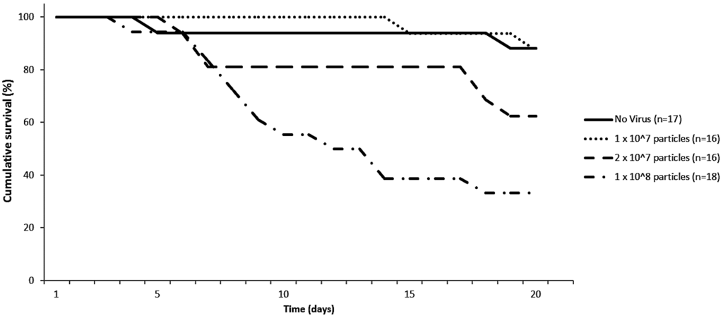 Cumulative survival percentage of bumblebees (Bombus terrestris) of the same age fed with different Israeli acute paralysis virus (IAPV) concentrations.