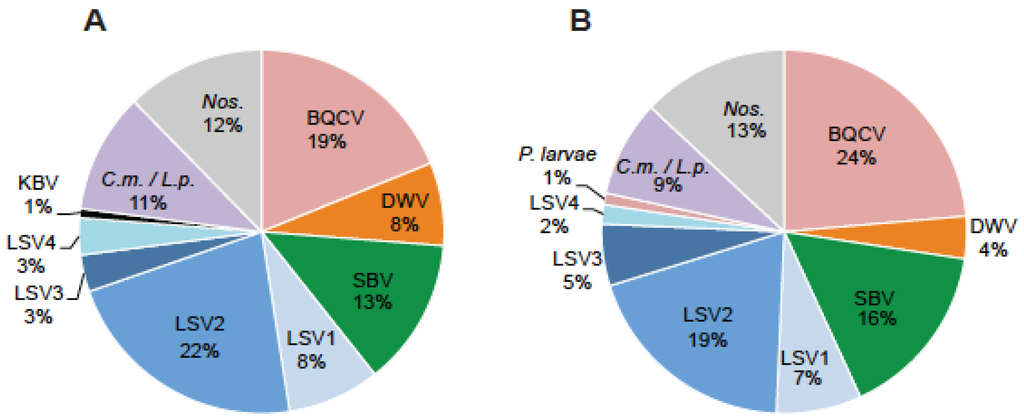 Distribution of honey bee pathogens detected in weak and strong colonies. Honey bee samples were obtained from 54 monitor colonies from October 2013 to June 2014. PCR was used to test for 16 honey bee infecting pathogens including: viruses (ABPV, BQCV, CBPV, DWV, IAPV, KBV, SBV, LSV1, LSV2, LSV3, LSV4, and LSV5, microsporidia (Nosema spp.; Nos.), bacteria (P. larvae and M. plutonius), and trypanosomatids (Crithidia mellificae, C.m./Lotmaria passim L.p.). The pathogen distribution in (A) weak (<5 frames; n = 41) or (B) strong (>9 frames; n = 81) honey bee colonies is shown as a percentage of the total number of pathogen-specific PCR tests.