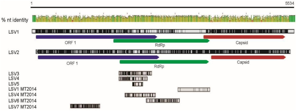 Lake Sinai viruses—genome comparison and LSV1 and LSV2 genomes extended. Lake Sinai virus nucleotide alignments using LSV1 (HQ871931) as the reference genome for numbering. The consensus sequence view, high peak height and green color represent maximum nucleotide identity of 100%, low peak height and red color indicate low nucleotide identity. Lake Sinai virus sequences (LSV1, Lake Sinai virus 1 (HQ871931); LSV2, Lake Sinai virus 2 (HQ888865); LSV3, Lake Sinai virus 3 (JQ480620); LSV4, Lake Sinai virus 4 (JX878492); LSV5, Lake Sinai virus 5 (KC880124), and 2014MT sequences: LSV1 (KR021356), LSV4 (KP892556), LSV6 (KR021357), and LSV7 (KR021355). Additional LSV sequences that were included in the Geneious nucleotide alignment using the default cost matrix (65% similarity (5.0/−4.0) []), but not depicted in this figure include LSV-Navarra, additional LSV5 sequences, and LSV-genomes from Belgium (Supplementary Table S2).