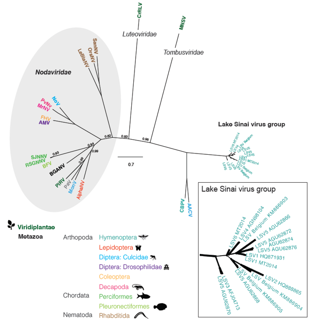 GenBank accession numbers for either the RdRp sequences or the genome sequences from where the RdRp sequence obtained are as follows: LSV1, Lake Sinai virus 1 (HQ871931), LSV1 MT2014 (KR021356), LSV2 (HQ888865), LSV3 (AFJ04713), LSV4 (AGN98104), LSV Belgium 2015 (KM886905), LSV Belgium 2015 (KM886903), LSV Belgium 2015 (KM886904), LSV6 MT2014 (KR021357), LSV5 JR (AGU62868), LSV5 JR (AGU62866), LSV5 JR (AGU62870), LSV5 JR (AGU62872), LSV5 JR (AGU62874), LSV5 JR (AGU62876), AACV, Anopheline-associated C virus RdRp (YP_009011225), CBPV, Chronic bee paralysis virus (YP_001911137), AlphaNV, Alphanodavirus RdRp (GU976287), MoNV, Mosinovirus RdRp (AIO11151), PaV, Pariacoto virus RdRp (NC_003691), PiRV, Pieris rapae virus RdRp (AY962576), BGANV, Bat guano associated nodavirus (HM228873), BFV, Barfin flounder nervous necrosis virus RdRp (NC_011063), SJNNV, Striped Jack nervous necrosis virus ProtA (NC_003448), RSGNNV, Redspotted grouper nervous necrosis virus (AAW32087), AMV, Drosophila melanogaster American nodavirus ProtA (GQ342965), FHV, Flock house virus RdRp (Q66929), MrNV, Macrobrachium rosenbergii nodavirus RdRp (NC_005094), PvNV, Penaeus vannamei nodavirus RdRp (NC_014978), NoV Nodamura virus RdRp (NC_002690, NP_077730), LeBNV, Le Blanc nodavirus (JQ943579), OrsNV, Orsay nodavirus RdRp (HM030970), SanNV, Santeuil nodavirus RdRp (NC_015069), MNSV, Melon necrotic spot virus RdRp (53276), CrRLV, Carrot red leaf virus RdRp (YP_077186).