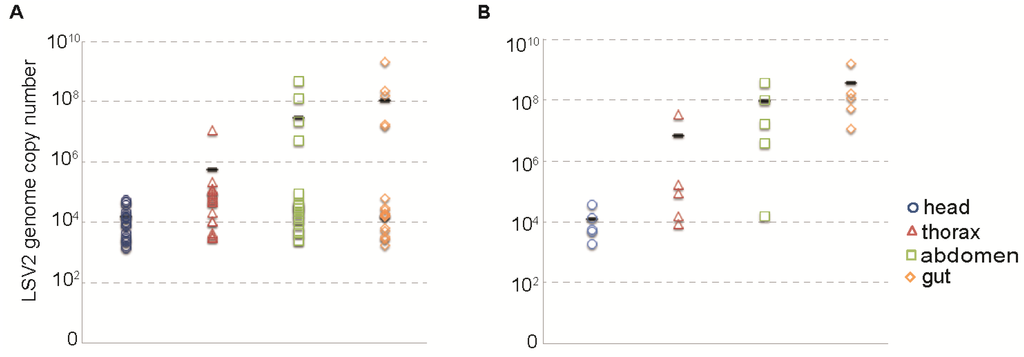 Relative distribution of LSV2 in honey bees. (A) LSV2-infected adult honey bees (n = 22) were dissected (head, thorax, abdomen, and gut) and the relative abundance of LSV2 was assessed by qPCR. The average copy number per 1 µg RNA of each region (x-axis) is as follows: head—1.56 × 104, thorax—1.96 × 106, abdomen—2.72 × 107, and gut—1.07 × 108 (represented by a black dash); (B) Bees with highest LSV2 levels (n = 5) harbored the majority of virus in their gut—4.72 × 108 and abdomen—1.19 × 108 average copy number per 1 µg RNA (black dash), compared to lower copy numbers detected in the thorax—8.42 × 106 and head—1.55 × 105 regions.