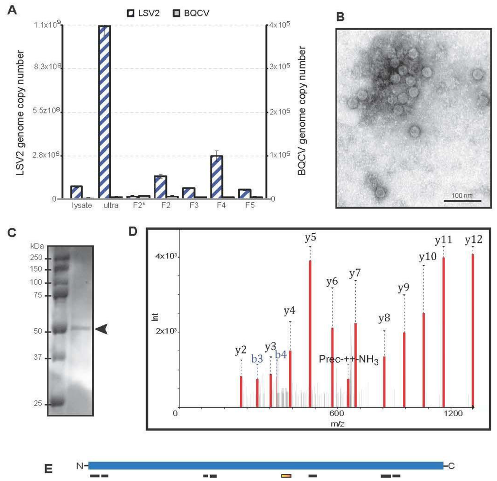 In order to visualize LSV2 capsids, the viruses in fraction 4 (F4) were imaged using a transmission electron microscope (TEM) at 37,000× magnification. Fraction 4 contained the most LSV2 genome copies and 5477× more LSV2 genome copies than BQCV. The TEM images indicated that LSV2 capsids are icosahedral with an average diameter of 27.7 ± 3 nm (Figure 5B). To further support that F4 contained primarily LSV2 virions, the proteins contained in that fraction were analyzed by SDS-PAGE, and a single protein band was visualized by Coomassie staining (Figure 5C). The putative LSV2 capsid protein (MW 57.3 kDa) band was isolated and analyzed by nano-HPLC-ESI mass spectrometry. An example spectrum and fragment ions from MS are provided for peptide 1 (NVESSSQTVSSMPR), which corresponds to LSV2 capsid protein 286–300 aa (orange rectangle) (Figure 5D–E). Excluding known contaminants (i.e., human keratin), a total of eight unique peptides identified the LSV2 capsid protein in the staining band (Figure 5C–E, Supplementary Table S4). The eight LSV2 corresponding peptides had a Peptide Shaker score and confidence of 100, and covered 18.85% of the LSV2 capsid protein sequence (GI: 335057591) (Figure 5E, Supplementary Table S4). In addition, one peptide corresponding to Apis mellifera Major royal jelly protein 2 (UnitProt/Swiss-Prot 077061) was detected (Supplementary Table S4). This protein has a molecular weight similar to the LSV2 capsid protein and is very abundant in bees; therefore it likely contaminated our honey bee virus preparation. No significant non-contaminant hits were identified in the control region of the gel. Together these data indicate that we were able to augment samples for LSV2. Purification of virus isolates is critical to the development of reagents and infectious clones required to further investigate the interactions between LSV and its honey bee host.