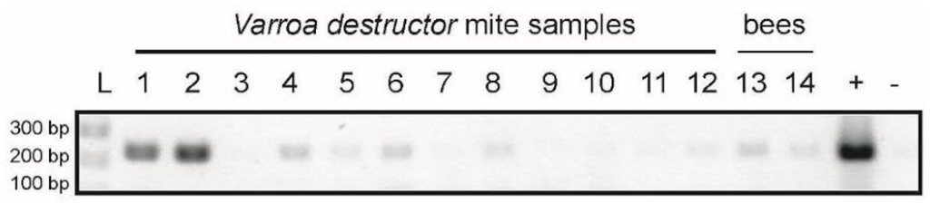 Lake Sinai virus detection in Varroa destructor mites and honey bees. Lake Sinai virus 2 specific PCR was used to detect LSV2 in mite and bee samples. Lanes 1–12 are individual Varroa destructor mite samples, lanes 13 and 14 are honey bee samples (n = 5 per sample) from the same colony; molecular weight marker (L), positive control (+), and negative control (−).
