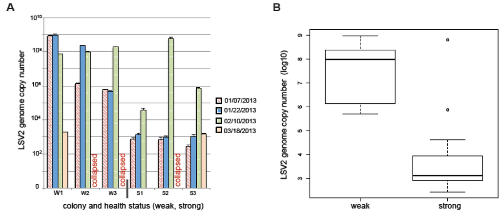 Both LSV1 and LSV2 abundance have been positively correlated with CCD []. In a small sample cohort, we compared LSV abundance to differential colony health (weak or strong, using colony size as a proxy for health) in six colonies over three months and determined that LSV2 abundance was the most statistically different in weak versus strong colonies. In addition, LSV1, BQCV, and Nosema ceranae abundances were also greater in weak colonies, as compared to strong colonies. Results from this pilot study illustrate the importance of examining the relationship between LSV prevalence and abundance in future longitudinal monitoring studies aimed at determining the relative effects of multiple biotic and abiotic factors on colony health.