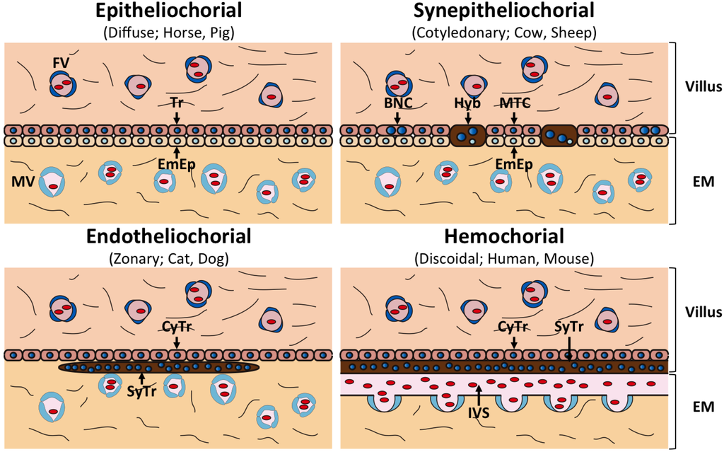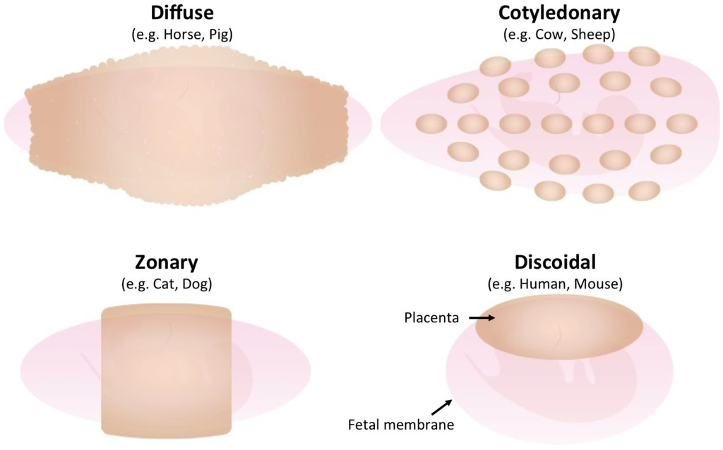 All placentas consist of fetal trophoblast cells and maternal uterine cells; however, placental morphologies differ between species [13]. The gross anatomical morphology of the placenta is divided into four groups: discoidal placenta (e.g., human, mouse), zonary placenta (e.g., cat, dog), cotyledonary placenta (e.g., cow, sheep) and diffuse placenta (e.g., horse, pig) (Figure 1). Each type of placenta has a unique microscopic anatomical feature, namely, hemochorial placenta (discoidal), endotheliochorial placenta (zonary), synepitheliochorial placenta (cotyledonary) and epitheliochorial placenta (diffuse) (Figure 2). The histological classification is defined by the morphology of the fetomaternal interface (Table 1).