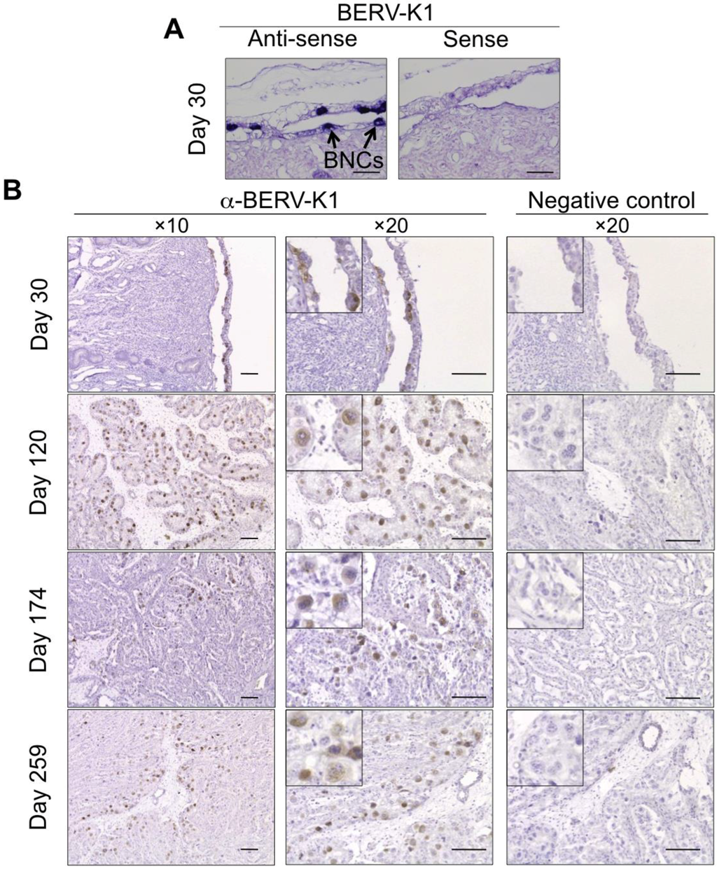 Expression of BERV-K1 envelope in bovine placental tissue. (A) In situ hybridization of BERV-K1 env mRNA on day 30 of gestation in the bovine fetal membrane and maternal endometrium. Scale bars represent 100 μm. DIG-labeled antisense probe for BERV-K1 env was used for the hybridization. BNCs express BERV-K1 env are shown as blue foci and as indicated by arrows; (B) Immunohistochemistry of bovine uterus and fetal membranes on days 30, 120, 174 and 259 gestation. Scale bars represent 100 μm. BNCs are enlarged in small panels. BERV-K1 Env was detected by anti-BERV-K1 Env and appear as brown foci.
