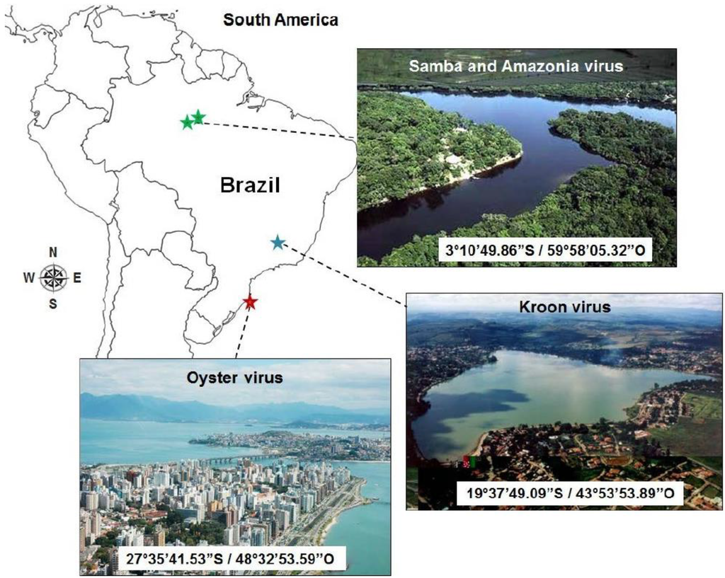 The viruses described in this work were isolated from: (A) Amazonia virus (AMAV): water sample from the Negro River, Amazon forest, in 2011; (B) Kroon virus (KROV): water sample from an urban lake in Lagoa Santa city, Minas Gerais State, in 2012; and (C) Oyster virus (OYTV): oyster samples farmed on the Atlantic coast, Florianópolis, Santa Catarina state, in 2013 [22] (Figure 1). The samples were cultured in A. castellanii monolayers and the isolated viruses were grown and purified as described previously [8].