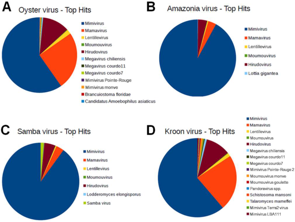 Graphical distribution of the best BLAST hits for Brazilian mimivirus gene contents. The analysis was performed using BLASTp algorithm searching with the predicted ORFs from Brazilian mimiviruses against the NCBI GenBank non-redundant (nr) protein sequence database using the java-based free software Blast2GO [29]. (A) Oyster virus; (B) Amazonia virus; (C) Samba virus; and (D) Kroon virus. The Acanthamoeba polyphaga mimivirus was the predominant target for hits from all Brazilian mimiviruses (896, 588 and 577 best hits to AMAV, OYTV and KROV, respectively), with an average of 76% of the hits.