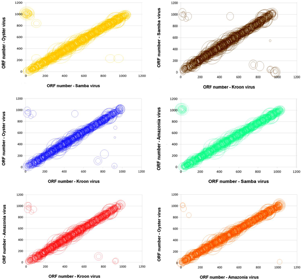 Genomic dot-plots based on a BLASTp analysis for pairs of Brazilian mimiviruses. Each circle shows a pair of orthologous proteins found in each pair of Brazilian mimiviruses. The diameters of the bubbles are proportional to the BLASTp similarity scores, and their positions are relative to the position of each pair in the genome.