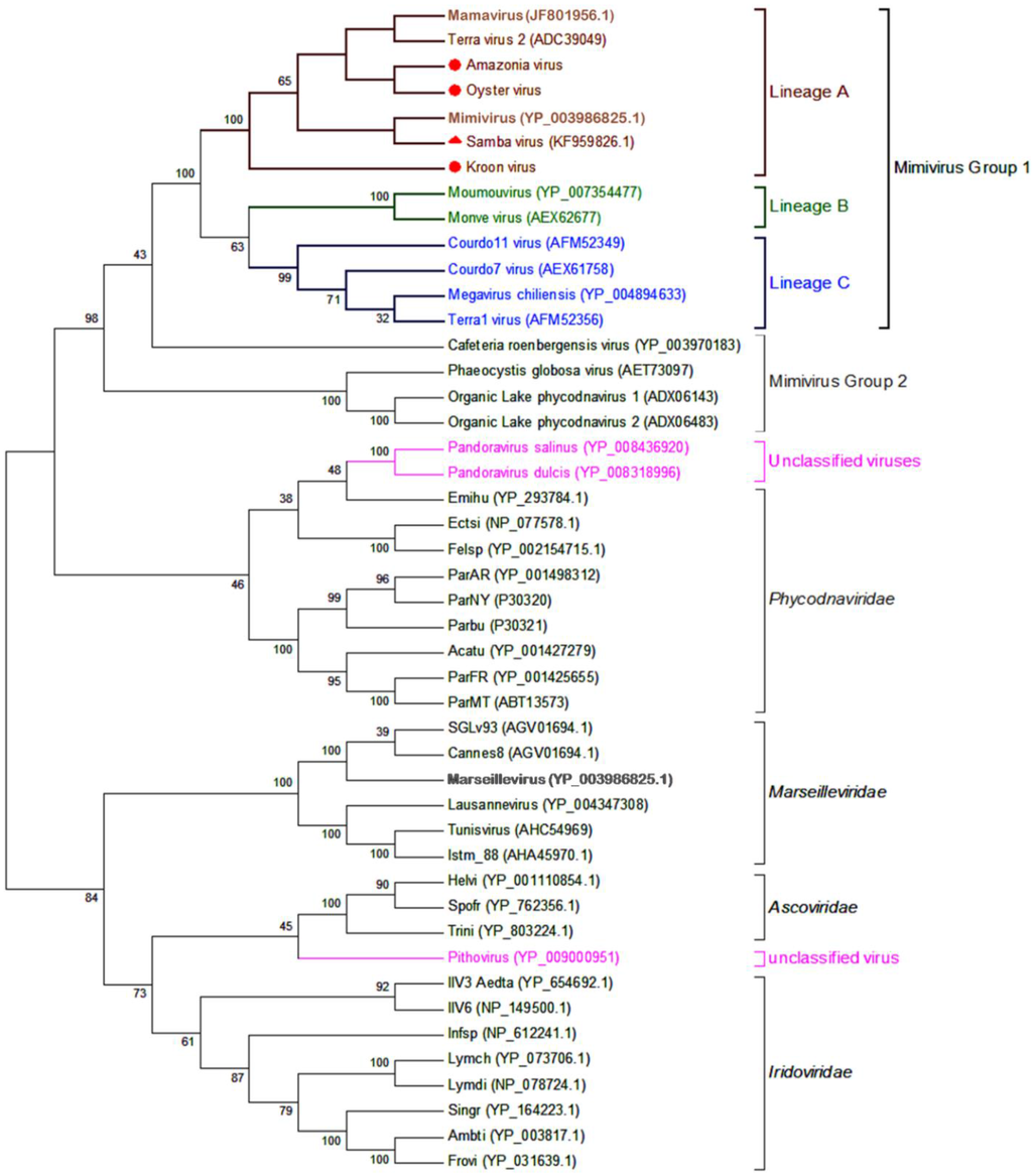 - Andrade, K.R.; Boratto, P.P.; Rodrigues, F.P.; Silva, L.C.; Dornas, F.P.; Pilotto, M.R.; La Scola, B.; Almeida, G.M.; Kroon, E.G.; Abrahao, J.S. Oysters as hot spots for mimivirus isolation. Arch. Virol. 2015, 160, 477–482. [Google Scholar] [CrossRef] [PubMed]