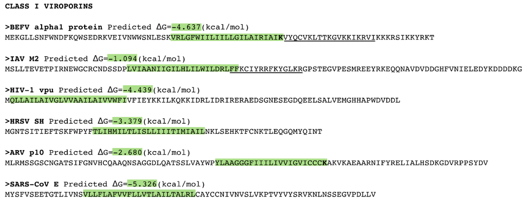 Sequence analysis of Class I and Class II viroporins. Sequence, in FASTA format, of the Class I viroporins included in this review. The putative transmembrane (TM) segments found by the ΔG Prediction Server v1.0 [13] and their predicted ΔG values (kcal/mol) are highlighted in green (indicating a negative ΔG value). The Lys residues within the TM segments are displayed in bold. Amphipathic TM flanking regions are underlined. BEFV Bovine ephemeral fever virus, IAV Influenza A virus, HIV Human immunodeficiency virus, HRSV Human respiratory syncytial virus, ARV Avian reovirus, SARS-CoV Severe acute respiratory syndrome Coronavirus.