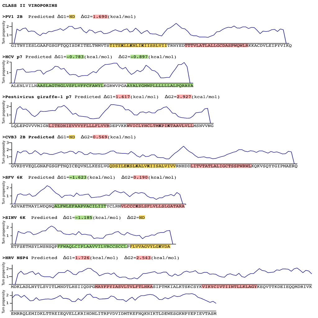 Sequence analysis of Class II viroporins. Sequence, in FASTA format, of the Class II viroporins included in this review. The putative TM segments found by the ΔG Prediction Server [13] and their predicted ΔG values (kcal/mol) are highlighted in green (indicating a negative ΔG value) or in red (positive ΔG value). Those TM segments for which existence there are evidences (experimental or computational) but were not detected (ND) by the algorithm are highlighted in yellow. The Lys residues within the TM segments are displayed in bold. A turn propensity plot is depicted above each protein sequence. For this analysis the turn propensity at each position was calculated using the data on Monné et al. and a slide window of 5 amino acids. PV1 Poliovirus 1, HCV Hepatitis C virus, CVB3 Coxsackievirus B3, SFV Semliki forest virus, SINV Sindbis virus, HRV Human rotavirus A.
