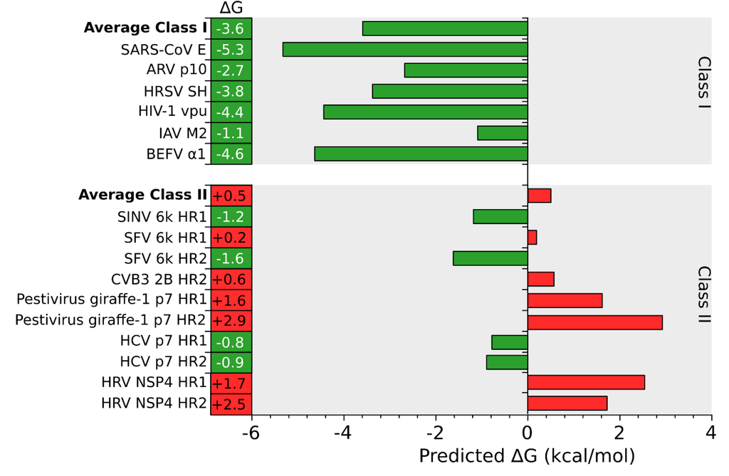 An in silico analysis of the hydrophobic profile of viroporins using the ΔG Prediction Server [13,14,15], an algorithm that predicts the presence of TM segments based on the apparent free energy difference (ΔGapp) for the insertion of a putative TM helix into the ER membrane by means of the Sec61 translocon, identifies for class I viroporins a single TM segment with highly favorable ΔG values (−3.59 kcal/mol in average ranging from -1.09 to -5.33 kcal/mol for the analyzed sequences) (Figure 1, Figure 2 and Figure 3). On the other hand, for class II viroporins the algorithm detects, not one but two TM segments with a surprisingly positive ΔGapp value (+0.5 kcal/mol in average). Furthermore, in some cases (eg. 2B from PV1) only one TM helix is predicted; the other hydrophobic region is not recognize as a TM by the algorithm, probably due to its low hydrophobicity, even though its presence has been experimentally confirmed [16].
