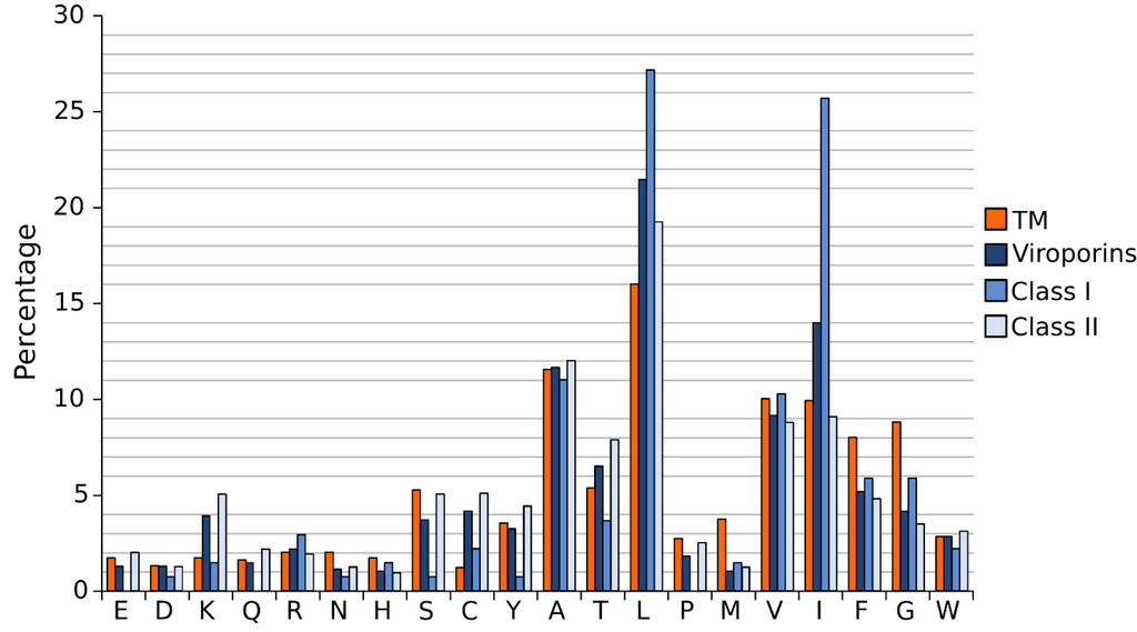 A close analysis of the hydrophobic regions of class I viroporin reveals an over-represented number of the highly hydrophobic Leu and Ile residues when compared to other TM segments (Figure 4). Figure 4 shows the amino acid composition of a small group of class I and II viroporins TM segments (data obtained from sequences presented in Figure 1 and Figure 2) compared to TM helices from membrane protein structures (data from [18]). This unusual number of Leu and Ile residues could be a consequence of their membrane architecture. In class I viroporins the single TM domain must be able to direct and anchor the protein to the membrane by itself. No interactions with other TM segments that could facilitate the insertion are possible at this point. Therefore, class I TM domains must be hydrophobic enough (higher percentage of highly hydrophobic residues) to fulfill the process successfully. Furthermore, regardless of the protein sequence the formation of a functional water-filled channel from monomeric helical subunits requires some amphipatic distribution. Consequently, in order to achieve quaternary structures an energy penalty step should be overcomed, either at stage I or at stage II of the insertion/folding process. Either polar residues that will end up facing the aqueous environment once the channel is formed must be inserted in the non polar membrane (stage I), or a hydrophobic surface is exposed to the water rich channel interior once the monomers create the water filled channel (stage II). In any case, this energy penalty must be compensated by other forces. Probably, by the favorable insertion of an elevated number of highly hydrophobic side chains (Leu and Ile) facing the lipids [63].