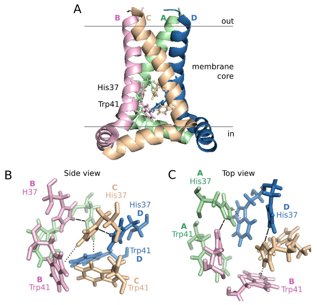 Structurally, both the full length M2 protein and its TM domain have been studied extensively using different techniques (i.e., SSNMR and X-ray crystallography) in various lipid mimetic enviroments [92,93,94,95,96]. Despite some differences, all the structures show a helical tetramer perpendicular to the membrane normal (Figure 5, panel A). The helix bundle leaves an aqueous pore lined by Val27, Ser31, Gly34, His37, Trp41, Asp44, and Arg45, which include all the hydrophilic residues present in the TM sequence. The motif responsible for proton conductance and tetramerization is the tetrameric His37-Trp41 cluster, referred as the HxxxW quartet (Figure 5). Interestingly, the hexamer formed by HCV p7 presents an internal pore which include, as in IAV M2, mostly hydrophilic residues (Ile6, Asn9, Ser12, Asn16, Trp21, Leu28, Arg35) [79].