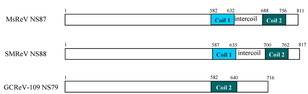 Diagram of predicted coil regions in the nonstructural proteins encoded by S4 segments among MsReV, SMReV and GCReV-109. MsReV NS87 and SMReV NS88 have two coiled coils (Coil 1 and Coil 2) and an intercoil spacing between the two coils, while GCReV-109 NS79 has only one coil (Coil 2). Numbers refer to amino acids residues.
