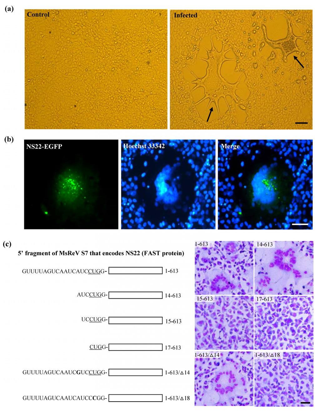 Experimental evidence on the function of MsReV FAST protein NS22. (a) Syncytium formation, a characteristic form of cytopathic effect (CPE) induced by MsReV in GCF cell lines at 72 h after infection. Arrows indicate the syncytia. Bar = 200 μm; (b) Fluorescence micrographs of GCF cells transfected with plasmid pEGFP-NS22. The expression of NS22-EGFP induced syncytium formation, while NS22-EGFP was distributed in the fused cells. Bar = 100 μm; (c) A series of recombinant plasmids containing different regions of S7 (5′ fragment of MsReV S7 that encodes the NS22), including full NA22-coding gene (1-613), deletions (14-613, 15-613, 17-613) and point mutations (1-613/∆14, 1-613/∆18). The putative start site (CUG) is underlined. GCF cells were transfected with the indicated constructs, and stained by Wright-Giemsa staining at 48 h post transfection. Representative images are present at the right. Expression of functional NS22 (1-613, 14-613 and 1-613/∆14) could lead to the production of syncytia, but the non-functional NS22 (15-613, 17-613 and 1-613/∆18) did not induce visible changes. Bar = 100 μm; (d) Each S7 genome segment organization and their encoded proteins in the reported aquareoviruses. NS22 ORFs are shown as shaded boxes in MsReV and SMReV, and NS16 ORFs are shown as shaded boxes in AGCRV, GCRV-873, and GSRV. But GCReV-109 lacks the NS22 ORF. Numbers indicate the size of the S7 genome segments and the first and last nucleotides of each ORF.