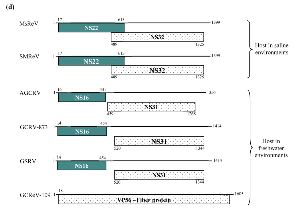 To assess the genomic variability of aquareoviruses and the relationships between the viruses and their host environments, here we investigated the aquareovirus genomic structure relationship with hosts in saline environments based on new as well as previously published sequence information, with a comparison of equivalent genomic segments and phylogenetic analysis. Moreover, the phenotype associated with the pathogenicity of specific gene MsReV NS22 was tested by construction and expression of plasmid with deletions or mutations.