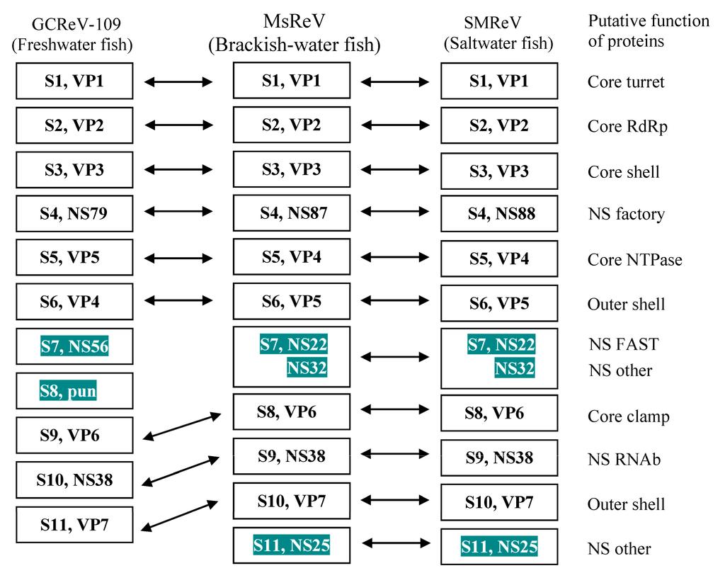 Functionally equivalent genome segments from the three aquareoviruses, MsReV, SMReV and GCReV-109 were analyzed. The MsReV and SMReV genome segments encode 12 proteins, respectively, which consist of seven structural proteins (VP1 to VP7) and five nonstructural proteins (NS87 or NS88, NS22, NS32, NS38 and NS25). However, GCReV-109 genome segments encode only 11 proteins, which consist of seven structural proteins and four nonstructural proteins (NS79, NS56, pun and NS38). GCReV-109 lacks the genes encoding the nonstructural proteins (NS22 and NS25), and S8 encodes a protein of unknown function (pun) that has no equivalent protein in MsReV and SMReV. These results showed that MsReV was more closely related to SMReV than to GCReV-109 (Figure 4).