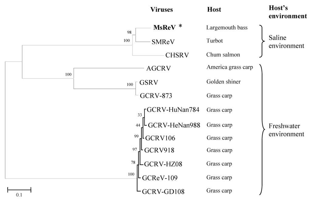 The open reading frame (ORF) analysis revealed that all of MsReV genome segments contained a single ORF, with the exception of S7 segment, which had two partially overlapping ORFs. MsReV was predicted to encode a total of 12 proteins, including seven structural proteins (VP1 to VP7) and five nonstructural proteins (NS87, NS22, NS32, NS38 and NS25) (Figure 1b, right panel). Alignments of the concatenated sequences of seven structural proteins from 13 aquareoviruses revealed that MsReV showed high sequence identities with SMReV (91.2%) and chum salmon reovirus (CHSRV) (85.5%) from hosts in saline environments, but a low level of identity (30.4%–48.5%) with other aquareoviruses from hosts in freshwater environments (Table 1).