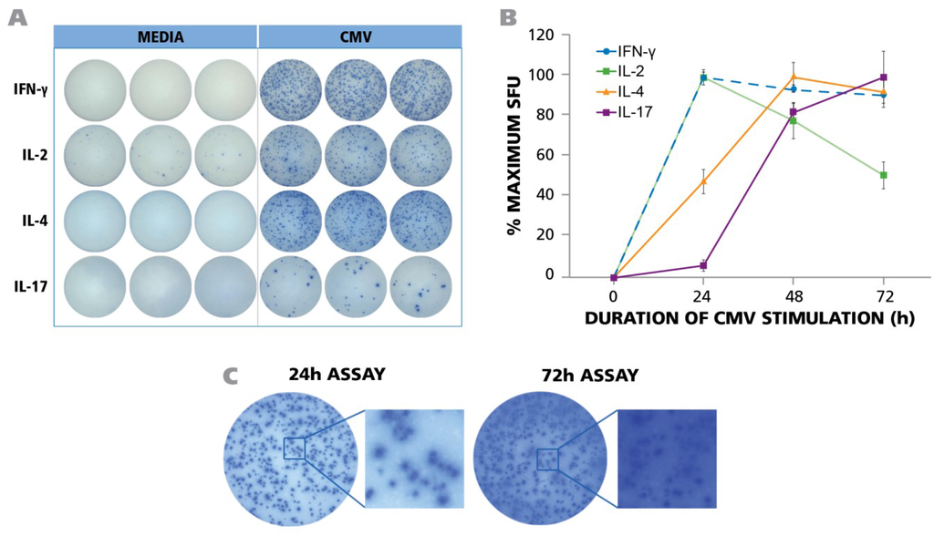 PBMC from 45 donors was tested in ELISPOT assays without adding HCMV (antigen) or in the presence of UV-inactivated HCMV virions. The assay was performed as described in Materials and Methods with 250,000 PBMC per well and 50 μg/mL of HCMV antigen. (A) Representative well images of one donor for medium control and antigen-specific IFN-γ, IL-2, IL-4, and IL-17 assays are shown at the time point of peak secretion; (B) PBMC was stimulated with HCMV in ELISPOT assays for 24 h, 48 h, and 72 h. IFN-γ, IL-2, IL-4 and IL-17 responses exhibited as spot forming units (SFU) were recorded at each time point. (n = 3) (C) Maximal number of IFN-γ spots was observed at 24 h. At later time points (72 h) the ELISPOT image was over developed.