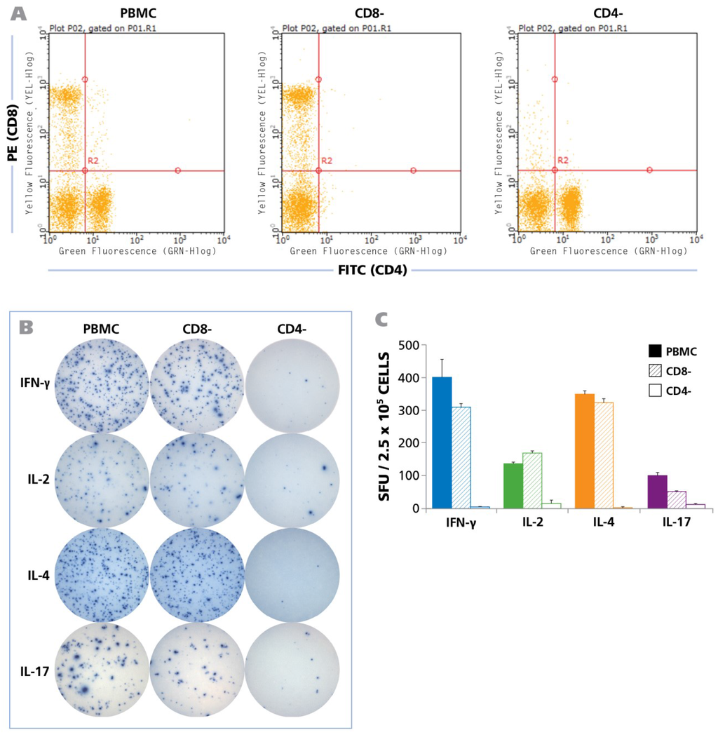 To define the cell type that produces the cytokines in question, we tested unpurified PBMC, and PBMC from the same donor from which either CD8 or CD4 cells were depleted by magnetic-bead based selection. The depleted population exhibited no trace of the depleted cell type as can be seen in Figure 3A showing the flow cytometry analysis of CD8-and CD4-stained cells. Testing the three PBMC variants showed that CD8 cell depletion caused a moderate reduction of the spot forming units, while CD4 depletion abrogated it (Figure 3B). Spot counts are shown in Figure 3C. The data show that within PBMC, CD4 cells represent the prevalent cell population that responded with production of IFN-γ, IL-2, IL-4, and IL-17 when stimulated with HCMV Grade 2 antigen. While a moderate decrease was seen in the CD8 depleted cell fraction as well, this is likely to result from the prolonged treatment of the cell sample during the isolation process, rather than from CD8 cells recognizing the HCMV Grade 2 antigen. Also the fact that CD4 cell depletion close to completely abrogated cytokine production argues against a significant participation of CD8 cells, as all CD8 cells are still present in the CD4 depleted fraction. The lack of cytokine response in the CD4 cell depleted PBMC also strongly argues against the possibility of cells of the innate immune system responding to the antigen. Further supporting the latter notion, no cytokines were triggered in PBMC donors that were seronegative to HCMV (Figure 4 and Table S1).