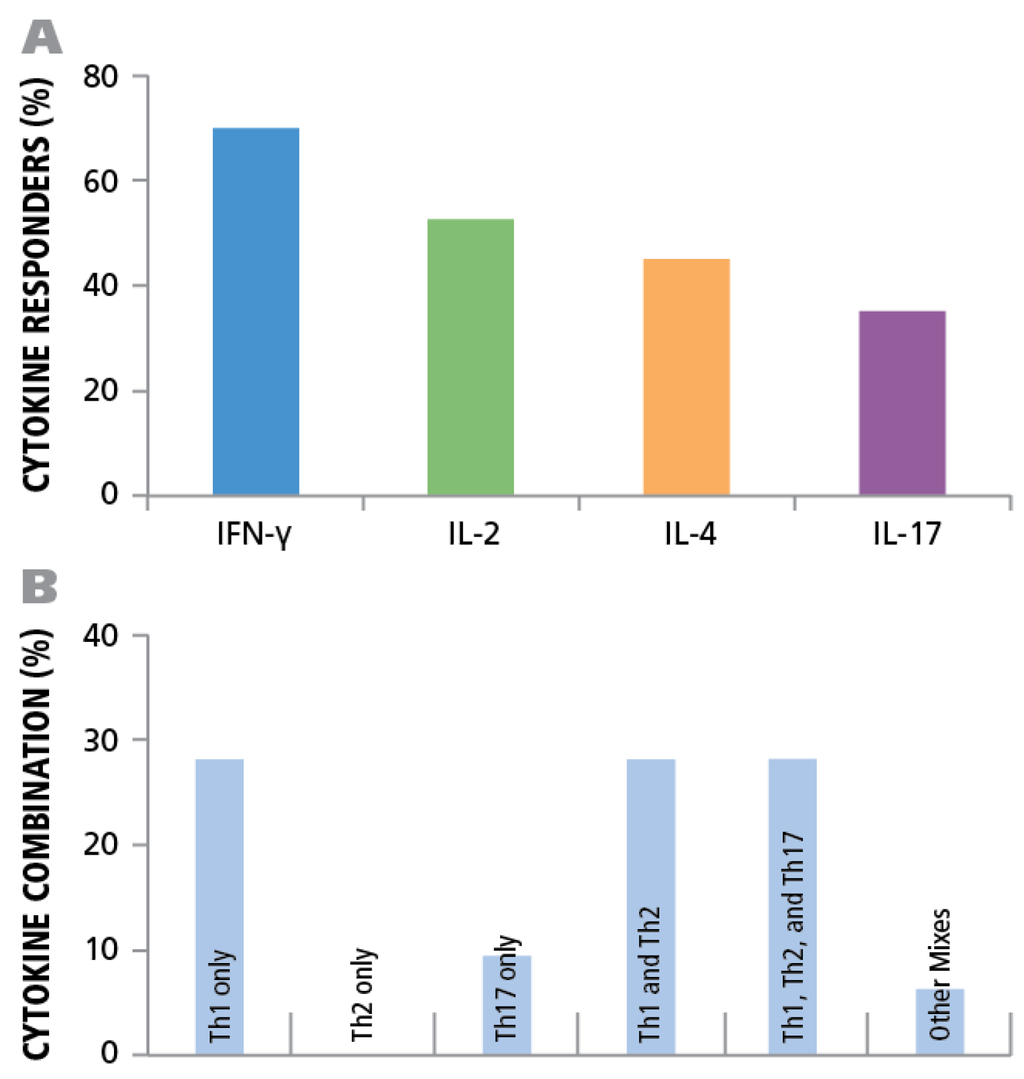 While IFN-γ, IL-4, and IL-17 are typically expressed in a mutually exclusive manner by the dedicated TH1, TH2, and TH17 CD4 subsets respectively, IL-2 can be co-expressed along with IFN-γ [,]. Therefore, when studying co-expression of cytokines we focused on IL-2 and IFN-γ measurements, where co-expression can be expected. The other cytokines were studied individually as co-expression was not expected. IL-2 is also frequently expressed in isolation (without IFN-γ, or IL-4, or IL-17) by a T cell subset called THpp that is thought to represent uncommitted precursor T cells capable of differentiation into TH1, TH2, or TH17 cells []. It has been observed in several infectious diseases that the number of T cells that co-express IL-2 and IFN-γ, so called polyfunctional T cells, are positively correlated with protection from the infection [,,,].
